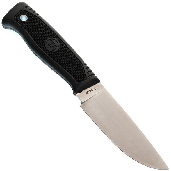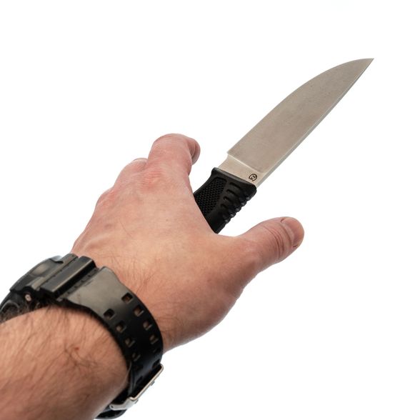 Этот нож имеет эргономичную резиновую рукоять черного цвета, которая обеспечивает превосходный захват даже во влажных условиях. Благодаря своей устойчивости к воде, она не скользит и не теряет сцепление даже при интенсивном использовании. Кроме того, рукоять способна поглощать вибрации, что делает работу с ножом более комфортной и безопасной для пользователя.