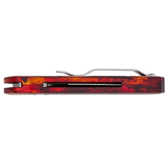 Рукоять ножа изготовлена из прочного алюминия, который гарантирует лёгкость и долговечность конструкции. Особенностью этой модели является эффектное анодирование, напоминающее пламя, что придаёт изделию необычный и запоминающийся внешний вид. Кроме того, нож комплектуется удобной карманной клипсой для ношения в кармане.