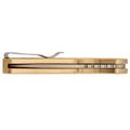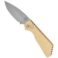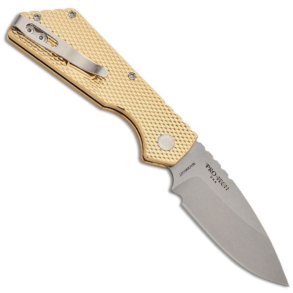Рукоять изготовлена из алюминиевой бронзы — сплава, отличающегося высокой износостойкостью и способного со временем приобрести патину. На рукояти имеется насечка, повышающая сцепление при использовании. Фирменная эргономичная форма от Strider позволяет удобно держать нож разными хватами, а клипса глубокой посадки обеспечивает надежное ношение.