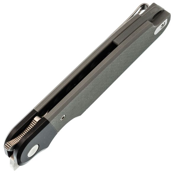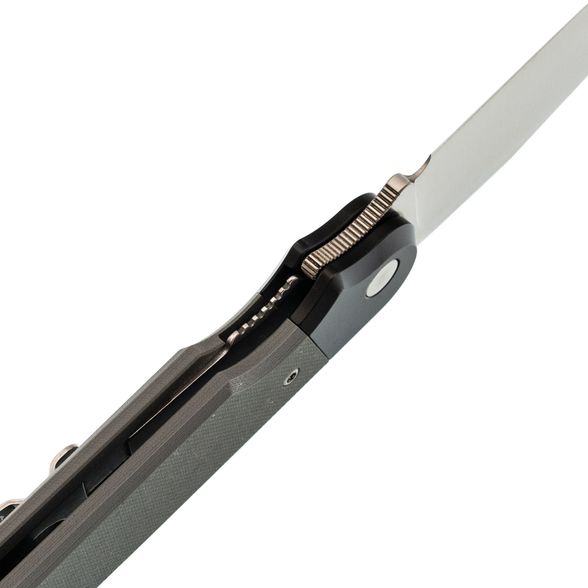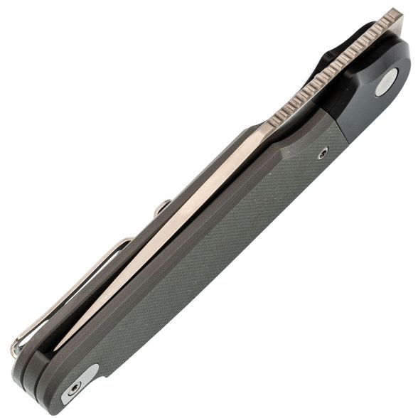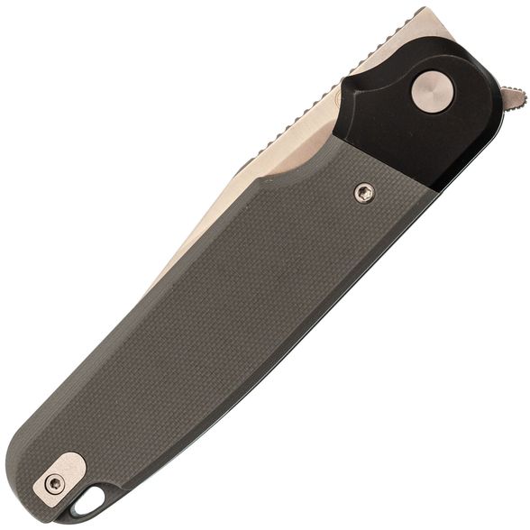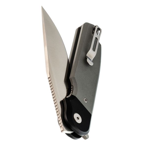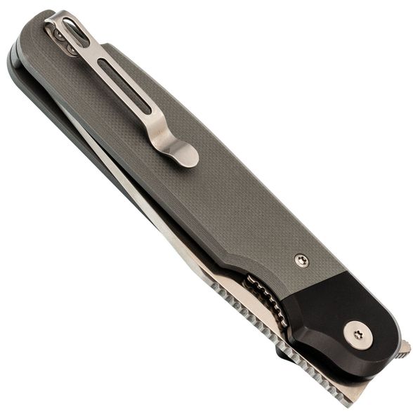 Рукоять изготовлена из стеклотекстолита G10, что гарантирует прочность и малый вес. Этот материал устойчив к воздействию влаги и не выцветает со временем. Модель оснащена алюминиевым больстером, который добавляет ножу стильности. Надежность работы обеспечивает замок Liner-Lock, подходящий для любых повседневных задач, а переставляемая клипса позволяет удобно носить нож с собой.