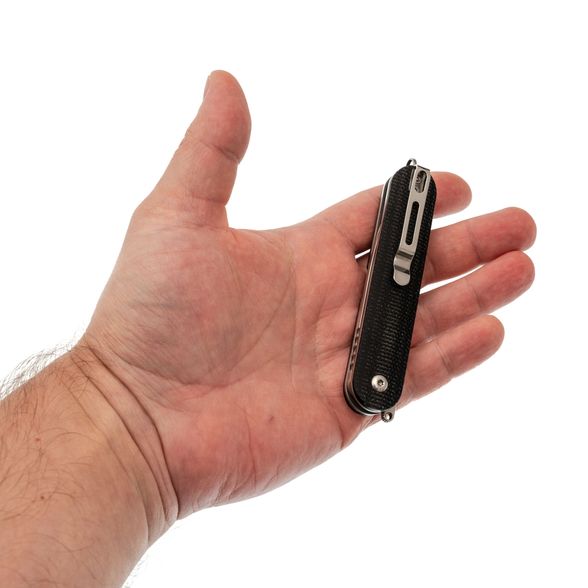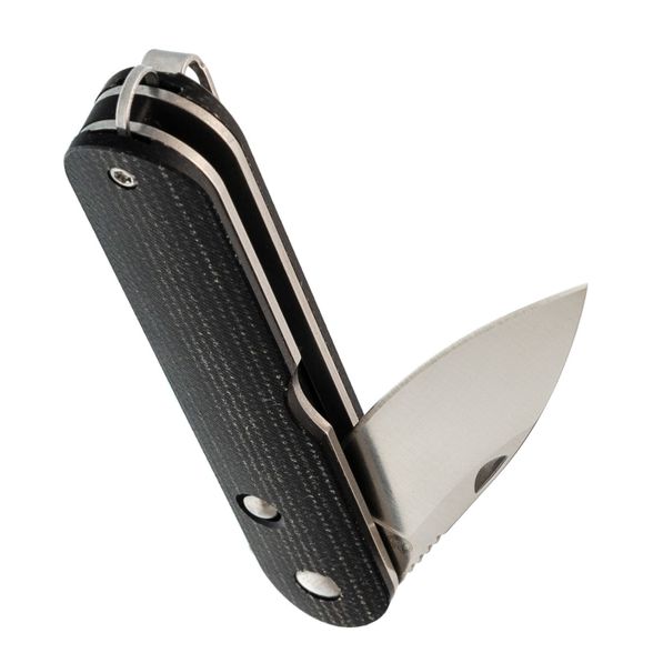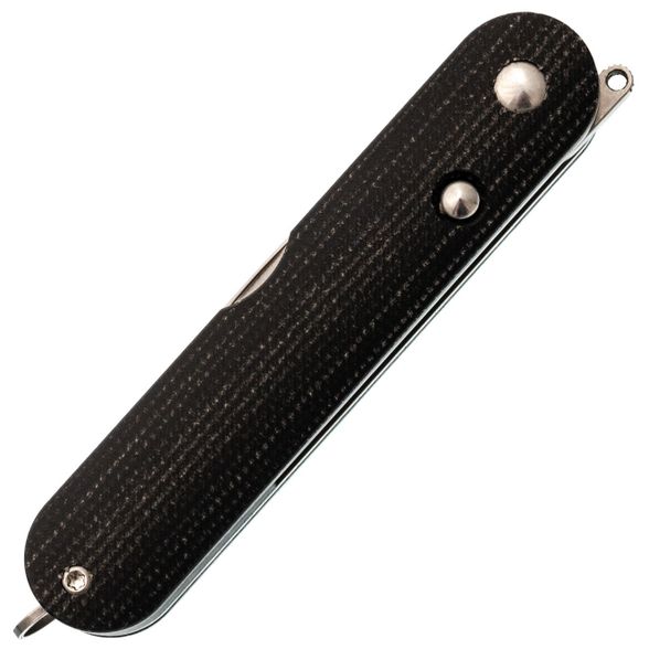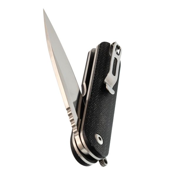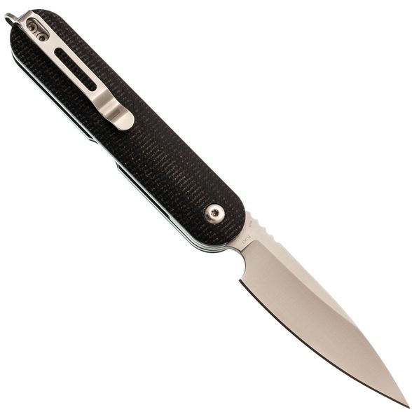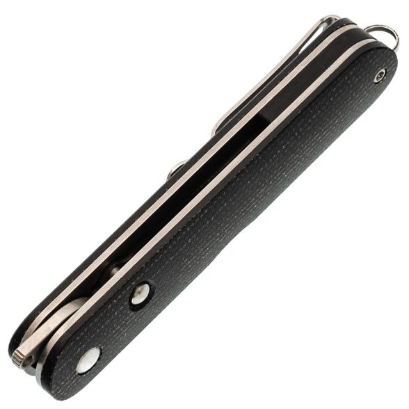 Рукоять имеет вытянутую округлую форму, благодаря чему нож в сложенном состоянии выглядит элегантно и не напоминает традиционный складной нож. Изготовленная из микарты, она устойчива к воздействию воды и перепадам температур, оставаясь теплой и приятной на ощупь. Со временем микарта приобретает красивую патину, что придаёт ножу уникальный и благородный вид. Глубокая клипса позволяет удобно и незаметно носить нож, а антабка делает возможным использование темляка для персонализации аксессуара.