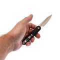 Клинок выполнен из высококачественной стали VG-10, которая славится длительным удержанием остроты и отличной стойкостью к коррозии. Это одна из лучших сталей в своём сегменте, обеспечивающая надежность и долговечность инструмента. Профиль клинка Spear-Point дарит высокую проникающую способность, однако благодаря высоким вогнутым спускам нож не только колет, но и великолепно режет. Открыть клинок можно как за ногтевой зацеп, так и инерционно с помощью замка Button-Lock, который гарантирует надежную фиксацию в открытом состоянии.