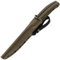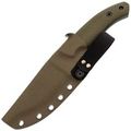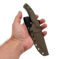 Монолитная рукоять с так называемым скрытым Full-Tang-монтажом гарантирует максимальную надёжность: хвостовик клинка полностью закрыт накладками, что исключает ощущение холода и создаёт цельную, неразборную конструкцию. Изогнутая форма с выраженной подпальцевой выемкой обеспечивает естественное положение руки и надёжную фиксацию. Мелкая насечка на поверхности G10 улучшает сцепление, а наличие отверстия для темляка позволяет дополнить аксессуар страховочным шнуром.