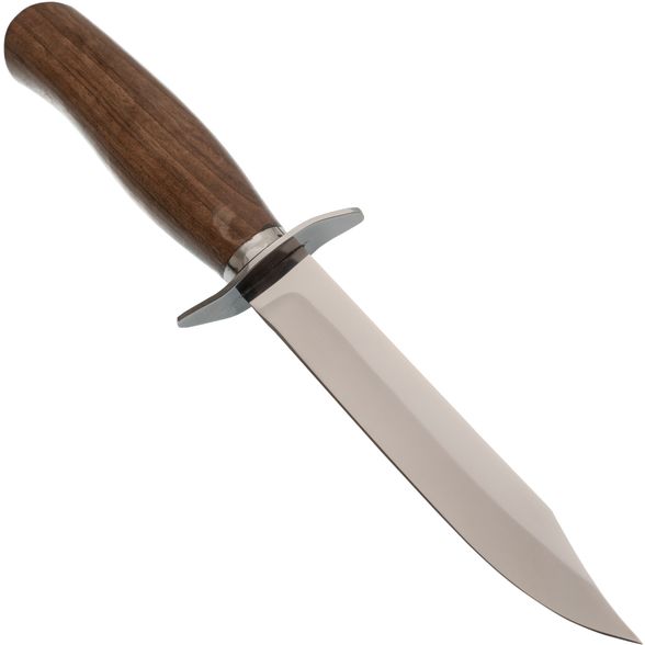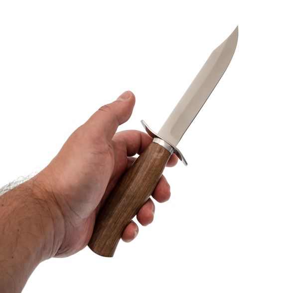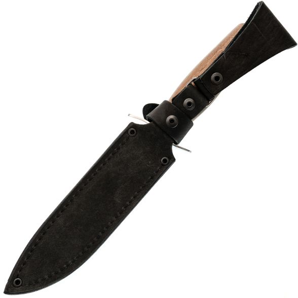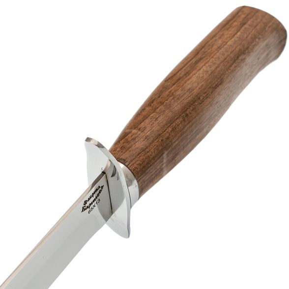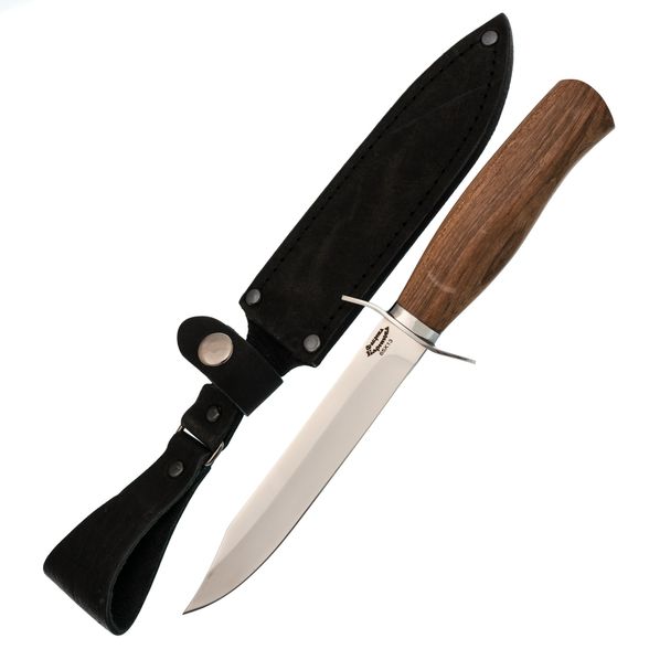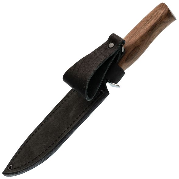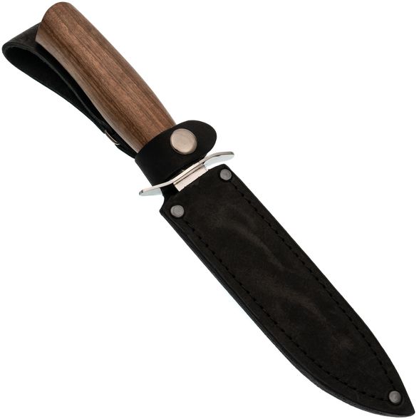 Удобная объемная рукоять НР-40 отлично заполняет руку и выполнена из прочного и эстетически привлекательного ореха. Этот материал обеспечивает надежное удержание и комфорт в использовании, делая нож идеальным спутником в любых условиях.