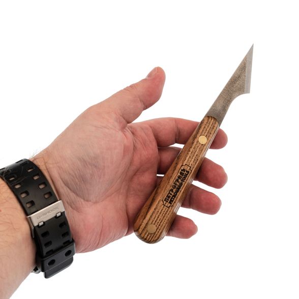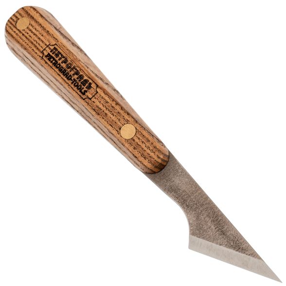 Нож ремесленный, косая заточка 30 градусов, правая заточка от фабрики столярных и плотницких инструментов “Петроградъ” - это одна из наиболее универсальных резчицких моделей. Основные его задачи - разметка, грубый съем материала, роспуск шпона и создание резчицких элементов декора. Помимо этого, инструмент подойдет для маркетри, интарсии, фанерования, работы с кожей и производства музыкальных инструментов. Косой нож для резьбы по дереву укомплектован клинком из стали 65Г, закаленной до 59-61 единиц по Роквеллу. Удобная прямоугольная рукоять со скосами изготовлена из древесины клена и пропитана маслом, что значительно продлевает срок ее эксплуатации.