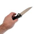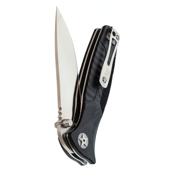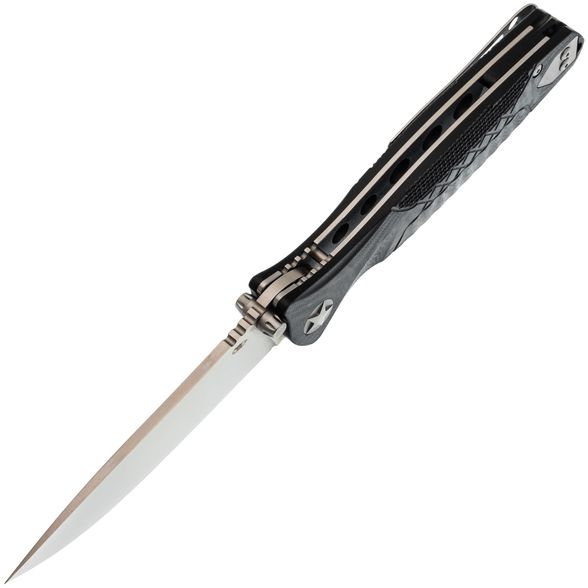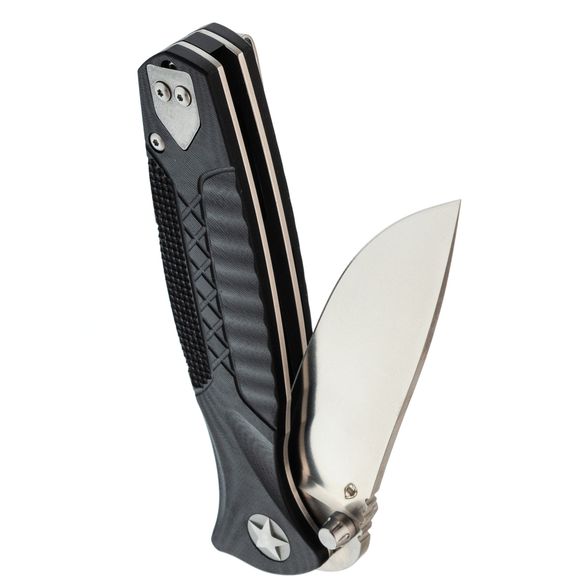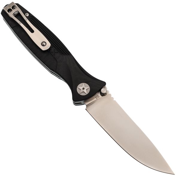 Клинок изготовлен из стали D2, которая славится своей износостойкостью и стойкостью режущей кромки. Благодаря классическому профилю Drop-Point, клинок универсален и подходит для любых типов работ — от резки до строгания. Высокие прямые спуски обеспечивают отличный рез, что делает этот нож практичным инструментом на каждый день. Открывается клинок с помощью шпеньков, расположенных с обеих сторон, что позволяет легко приводить его в рабочее положение любой рукой.