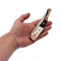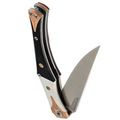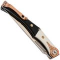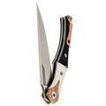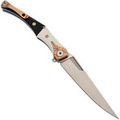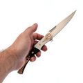 Клинок этого ножа выполнен из высококачественной японской стали VG-10, которая долго держит заточку и устойчива к коррозии. Такая сталь легко точится и сохраняет свои рабочие качества на протяжении долгого времени. Благодаря агрессивному профилю Clip-Point и прямым спускам, нож имеет отличные режущие характеристики и может справиться с любыми задачами, от точных резов до строгания.