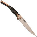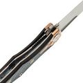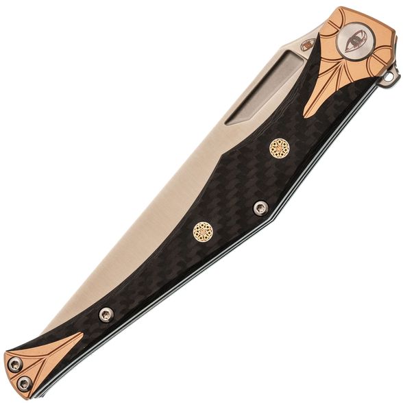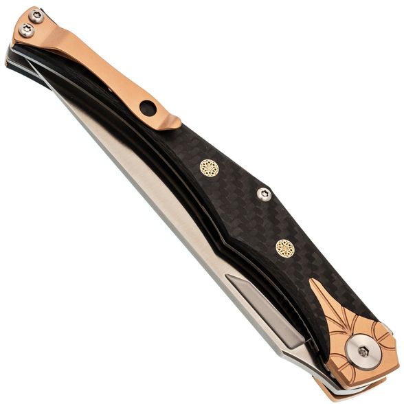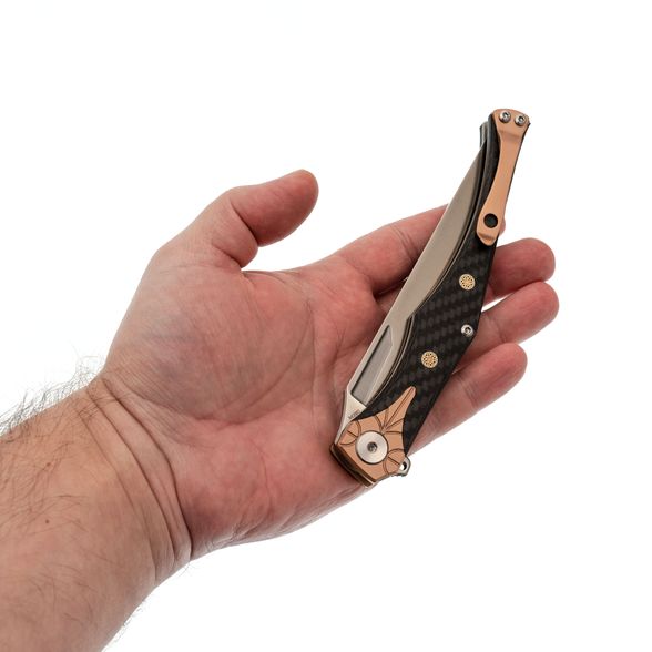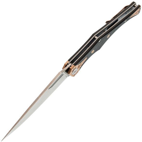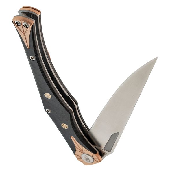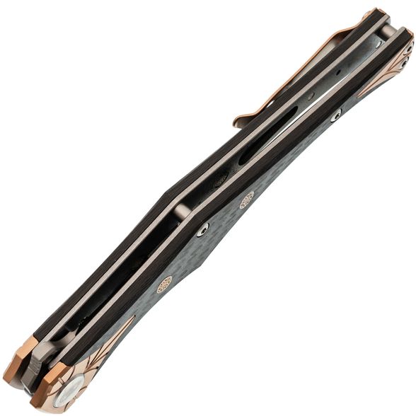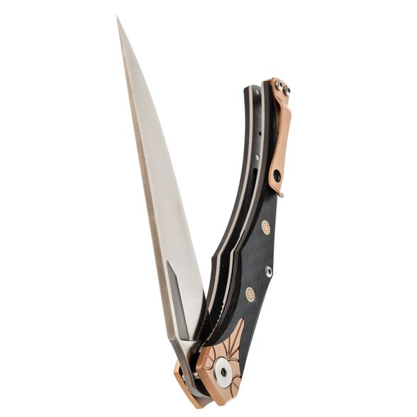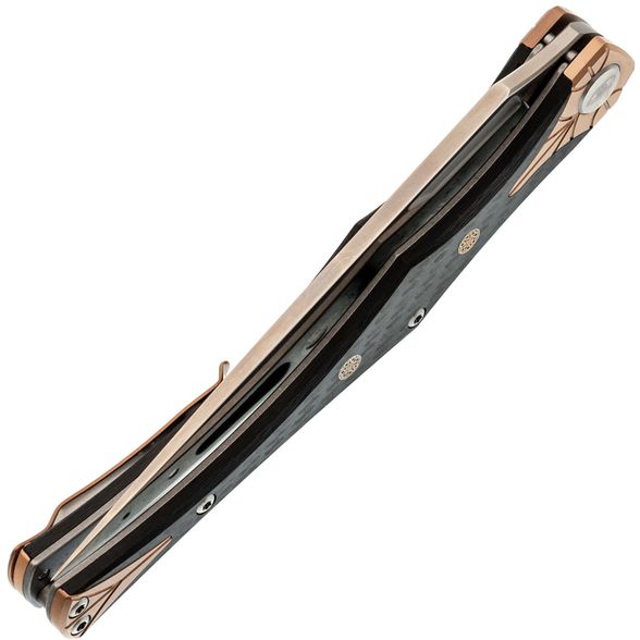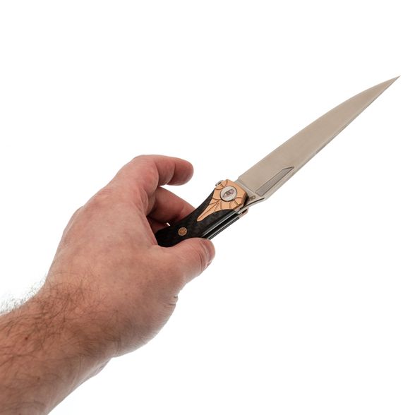 Рукоять выполнена из прочного стеклотекстолита G10, дополненного накладками из карбона – материала, обладающего высокой прочностью, малым весом и неприхотливостью. Декоративные алюминиевые вставки добавляют рукояти изысканности, подчеркивая её премиальный характер. Эргономичная форма, замок Liner-Lock и удобная клипса для ношения обеспечивают комфорт и безопасность при каждом использовании.