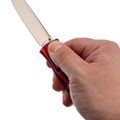 Клинок выполнен из стали VG-10, которая характеризуется высокой устойчивостью к износу и коррозии. Форма Clip-Point придаёт ножу отличные проникающие свойства, сохраняя при этом широкую сферу применения. Благодаря высоким прямым спускам лезвие демонстрирует хорошие режущие и строгательные качества.