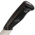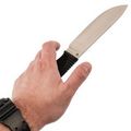 Рукоять ножа Ротный-2 изготовлена из резины, что делает ее легкой и неприхотливой в уходе. Она имеет цепкий текстурированный рисунок, обеспечивая надежный и комфортный хват. Рукоять хорошо заполняет руку, позволяя длительное время работать с ножом без усталости.