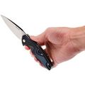 Вес ножа 147 грамм, а размер в закрытом состоянии – всего 12 сантиметров. Это позволяет брать его с собой в любой ситуации, так как он точно не будет занимать много места. Покупатели могут выбрать одну из двух расцветок: чёрную с синими узорами и коричневую с бежевыми узорами.