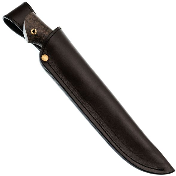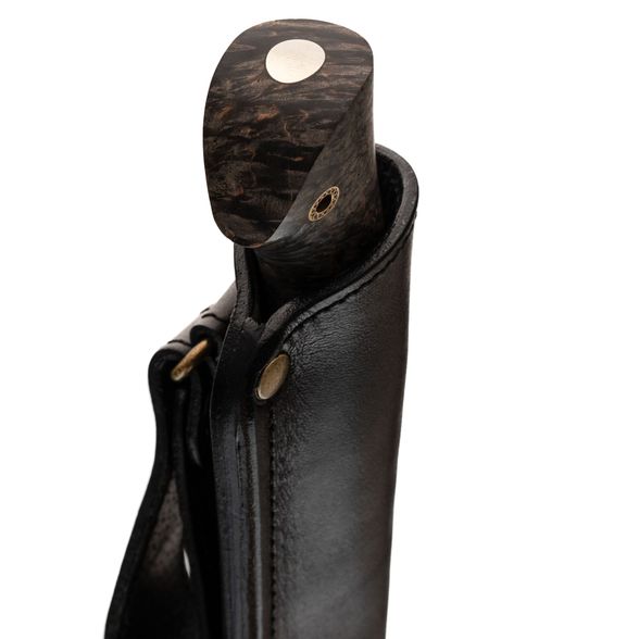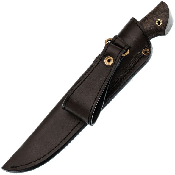 Погружная посадка фиксирует модель уверенно, а свободный подвес не мешает при ходьбе и смене позы. Плотная кожа растительного дубления защищает клинок и рукоять, чехол легко разрабатывается под владельца и позволяет быстро извлекать инструмент, когда нужно.