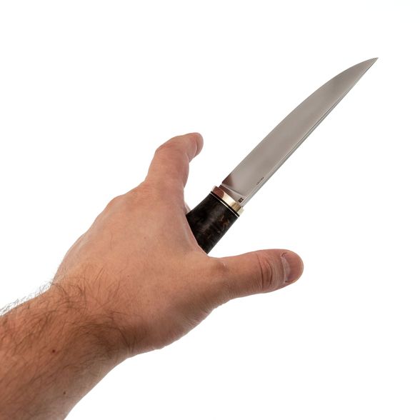 Drop-point здесь раскрывается полностью: выраженная линия брюшка помогает тянуть рез, аккуратно работать по продуктам и контролировать кончик. Прямые спуски от обуха дают тонкую клиновидную геометрию, которая охотно впивается в материал, а тонкое сведение отвечает за чистый, лёгкий рез.