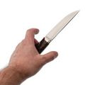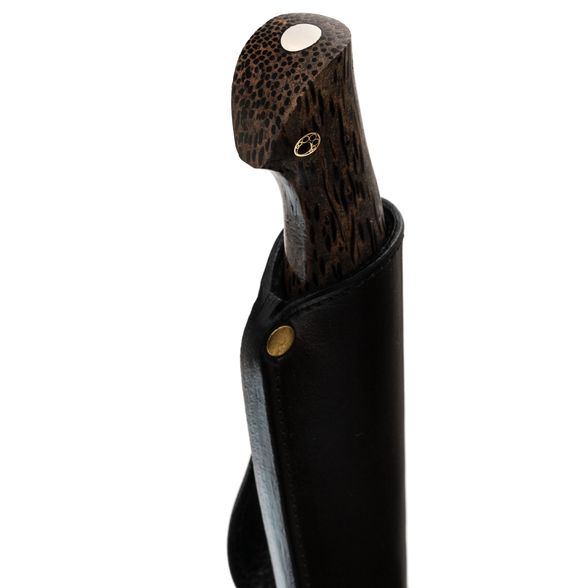Рукоять имеет эргономичную форму, идеально подстраиваясь под руку пользователя. Она изготовлена из стабилизированной древесины пальмы - редкого и экзотического материала, который придает ножу уникальный внешний вид. Стабилизация древесины делает рукоять влагостойкой, что важно для использования в полевых условиях. Сквозной монтаж обеспечивает надежное соединение и достаточную прочность, подходящую даже для туристических нужд.