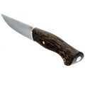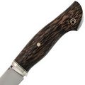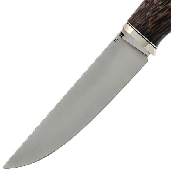 Клинок изготовлен из стали D2, известной своей прочностью и способностью долго держать заточку. Термообработка обеспечивает оптимальные характеристики стали, что особенно важно для охотничьего ножа, где требуется рез и разделка туши. Геометрия клинка продумана до мелочей: высокие прямые спуски обеспечивают легкое и эффективное резание, делая процесс разделки удобным и быстрым.