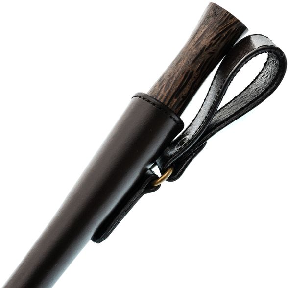 Ножны, выполненные из натуральной кожи растительного дубления, отличаются плотной структурой и долговечностью. Они надежно фиксируют нож, позволяя носить его рукоятью вниз без риска выпадения. Свободный подвес на ремень обеспечивает удобство ношения, не стесняя движений во время ходьбы или при сидении.