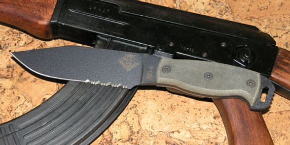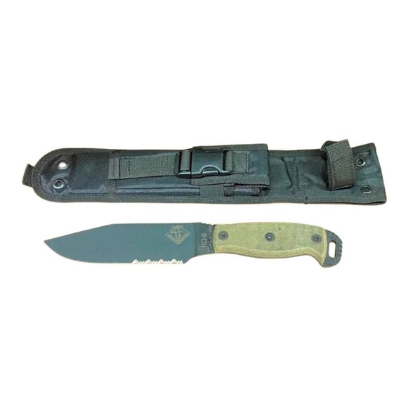 Нож RD6, сталь 5160, серрейтор, клинок черный, рукоять с отверстием (микарта).