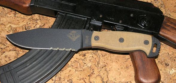 Нож RD6, сталь 5160, серрейтор, клинок черный, рукоять с отверстием (микарта).