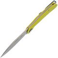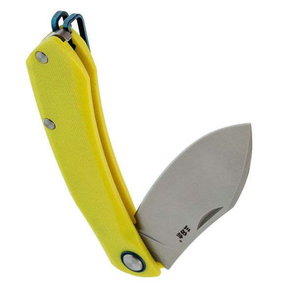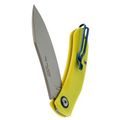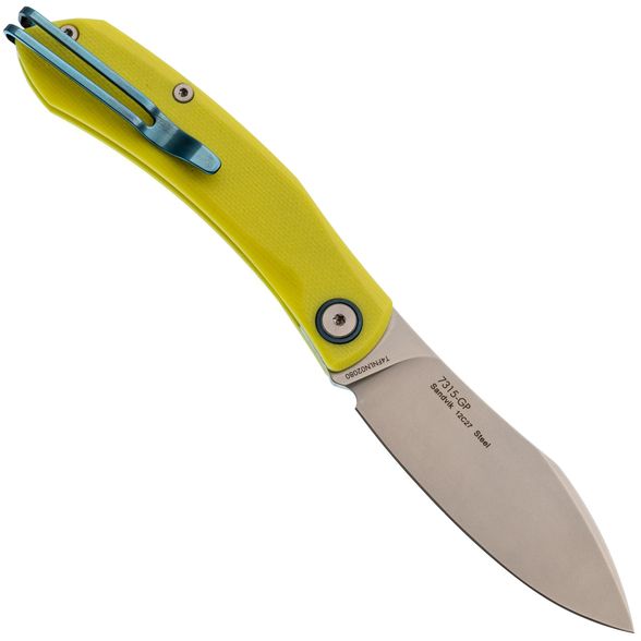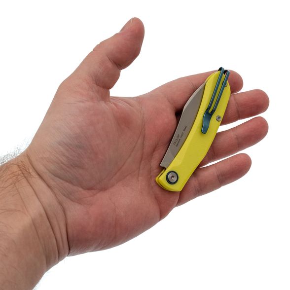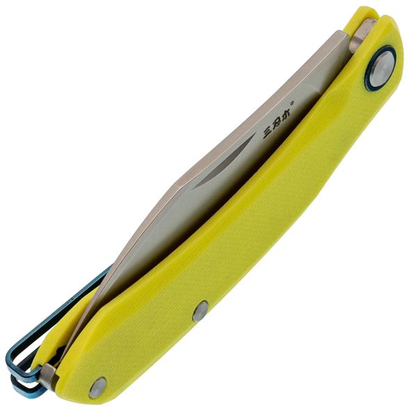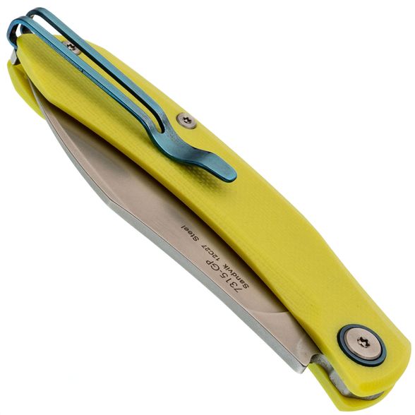 Рукоять изготовлена из ярко-салатового стеклотекстолита G10, который устойчив к механическим повреждениям и неблагоприятным условиям окружающей среды. Важной особенностью является отсутствие стальных лайнеров, благодаря чему нож остаётся очень лёгким. Салатовый цвет гармонично контрастирует с синими акцентами на рукояти и клипсе, что делает нож не только практичным, но и стильным аксессуаром. Модель также оснащена переставляемой пружинной клипсой, обеспечивающей удобное ношение.