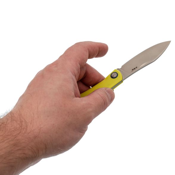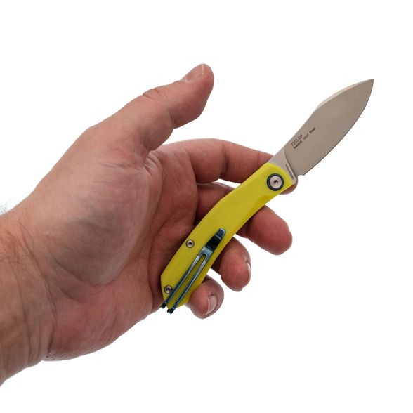 Клинок выполнен из стали 12C27, которая отличается отличной устойчивостью к коррозии и простой заточкой, что делает её идеальным выбором даже для новичков. С толщиной обуха 2.5 мм и прямыми спусками от обуха нож проявляет себя как превосходный инструмент для резки. Клинок открывается с помощью ногтевого зацепа, а механизм Slip-Joint удерживает его в открытом положении за счёт пружины. Это обеспечивает достаточную безопасность при повседневном использовании, хотя нож не предназначен для тяжёлых нагрузок.