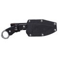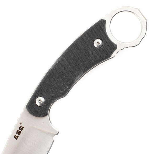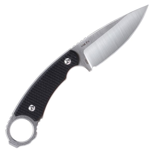 Рукоять из G10 выполнена в черном цвете с выраженной текстурой, обеспечивающей уверенный хват в любых условиях. Геометрия корпуса включает надежный упор, защищающий руку от соскальзывания при работе, а также темлячное отверстие для дополнительной фиксации или подвеса. Материал устойчив к влаге, грязи и механическим повреждениям, сохраняя форму и функциональность даже при длительном использовании на открытом воздухе.