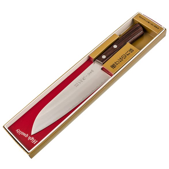 Нож Сантоку Kanetsugu Special Offer подходит для всех типов нарезки и шинковки, а также отлично отделяет мясо от костей. Прочная рукоять изготовлена из розового дерева, которое отличается особой крепостью, не рассыхается и хорошо противостоит влаге. Древесные накладки крепятся к основе 2 металлическими заклепками и легко переносят даже большой объем работы.