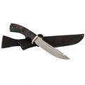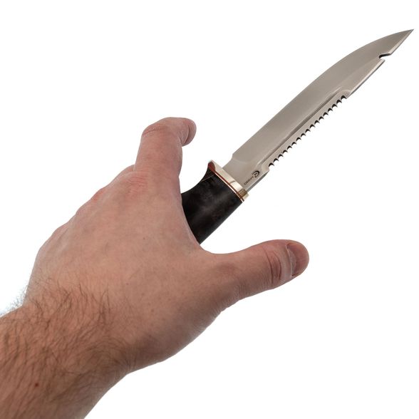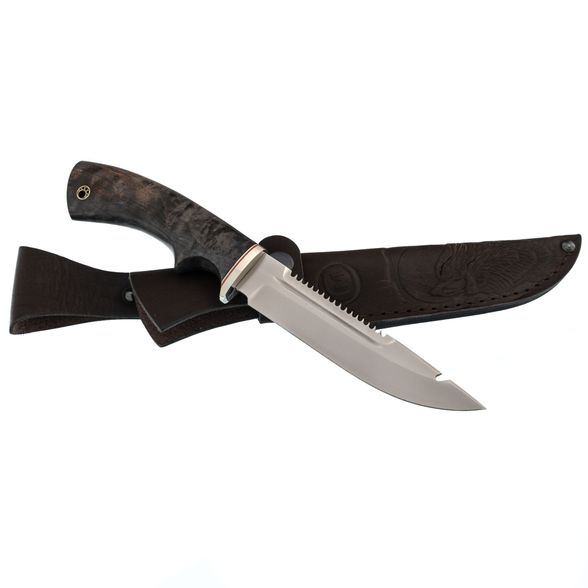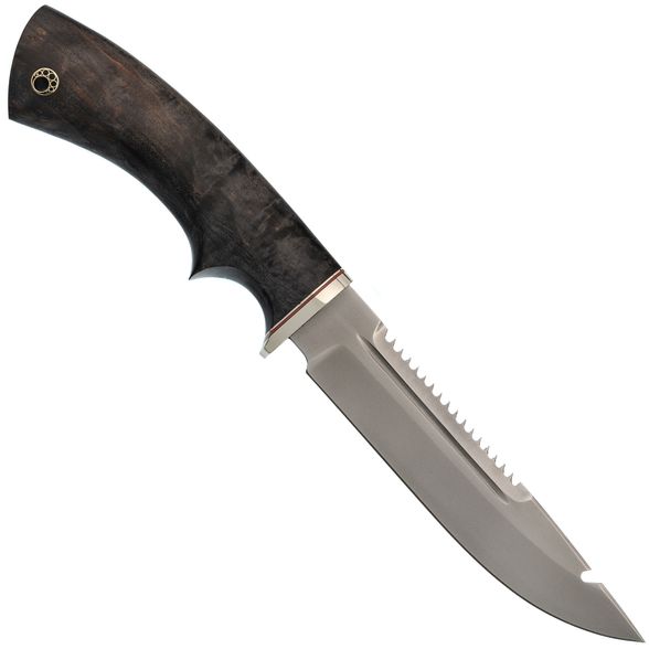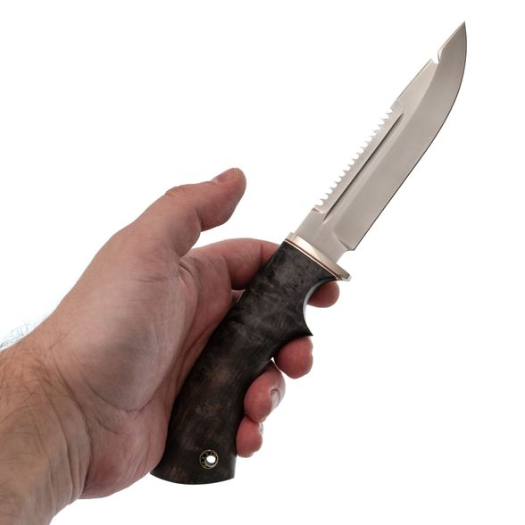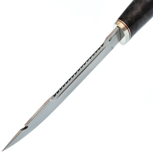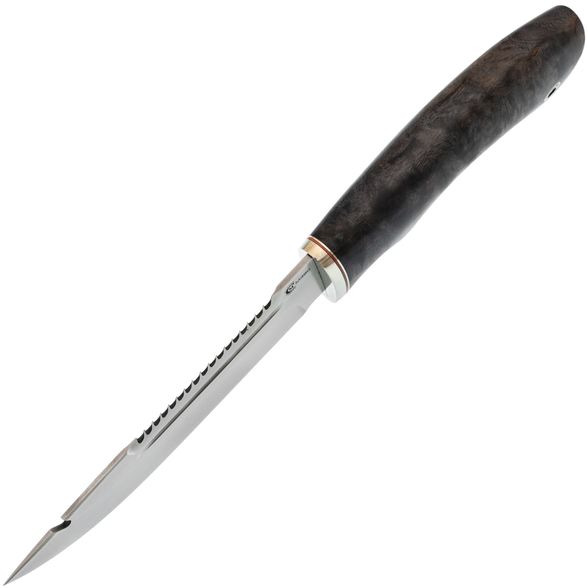 Рукоять ножа выполнена из стабилизированной карельской берёзы, что придаёт ей исключительную прочность и устойчивость к внешним воздействиям, включая влагу и перепады температуры. Такое дерево не боится воздействия воды, что особенно важно в условиях рыбалки. Эргономичная форма рукояти с двумя крупными подпальцевыми выемками обеспечивает уверенный и комфортный хват, предотвращая скольжение руки на клинок даже при влажных условиях.
