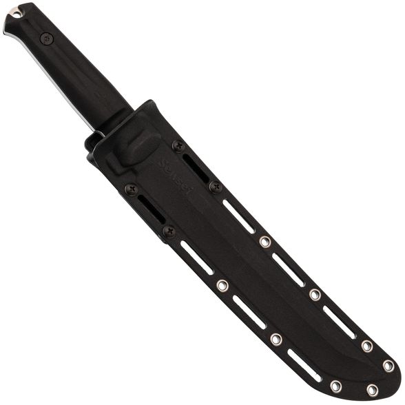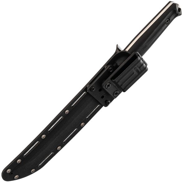 Рукоять со сменными накладками из мягкого кратона и полноразмерная односторонняя гарда гарантируют надежный хват. Легкие прочные ножны из полиамида снабжены многопозиционной клипсой, совместимы с системой крепления MOLLE.
