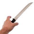 Подпальцевая часть рукояти достаточно широкая, и позволяет перехватывать нож ближе к ограничителю, или, наоборот, ближе к навершию, что увеличивает длину рычага при рубящем ударе.