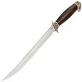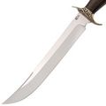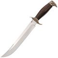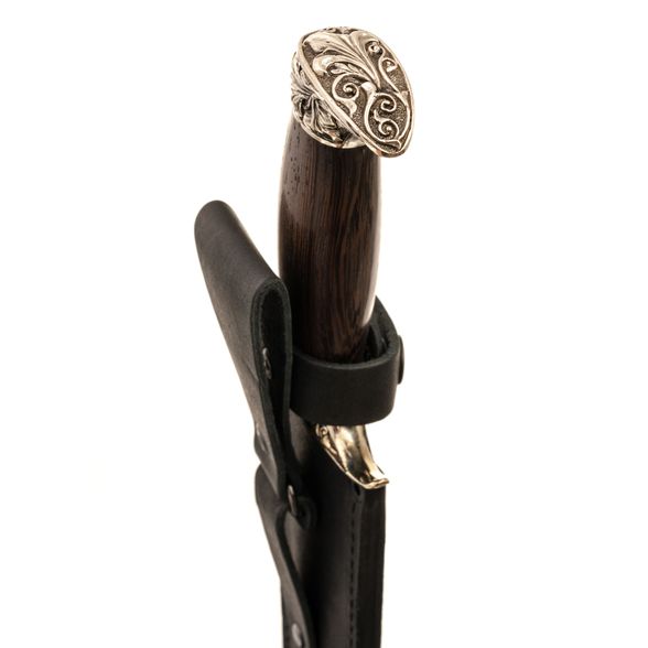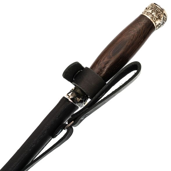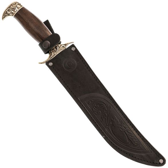 Рукоять ножа выполнена из дерева и латунной фурнитуры с художественным литьем, что придает ему элегантный и роскошный вид. Форма бочкообразной рукояти из венге отлично подходит для удобного захвата и позволяет работать с ним долгое время без усталости.
