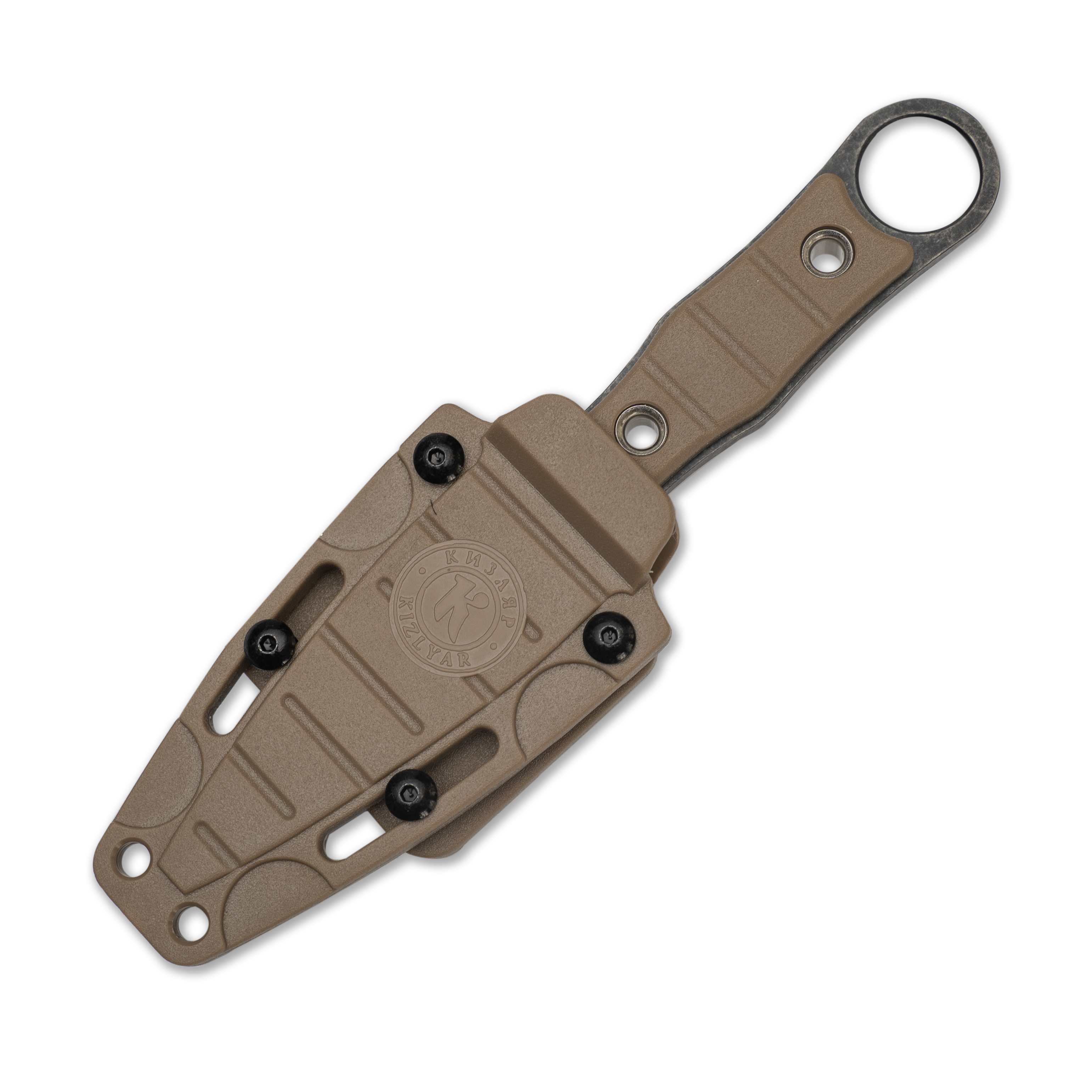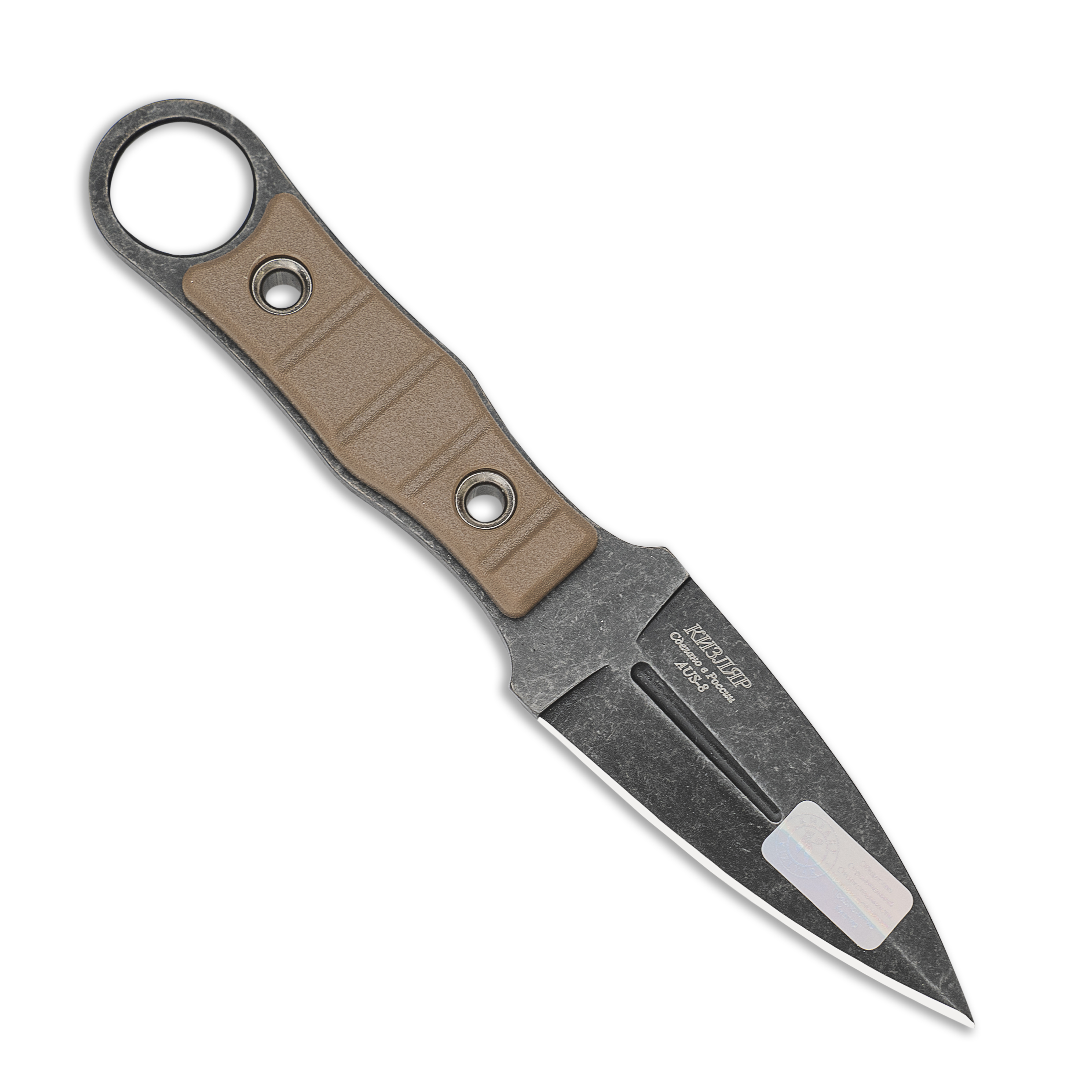 Песочные накладки с рельефом и выемками фиксируют ладонь, не перегружая рукоять лишними формами. Full-Tang добавляет ощущение цельной вещи.