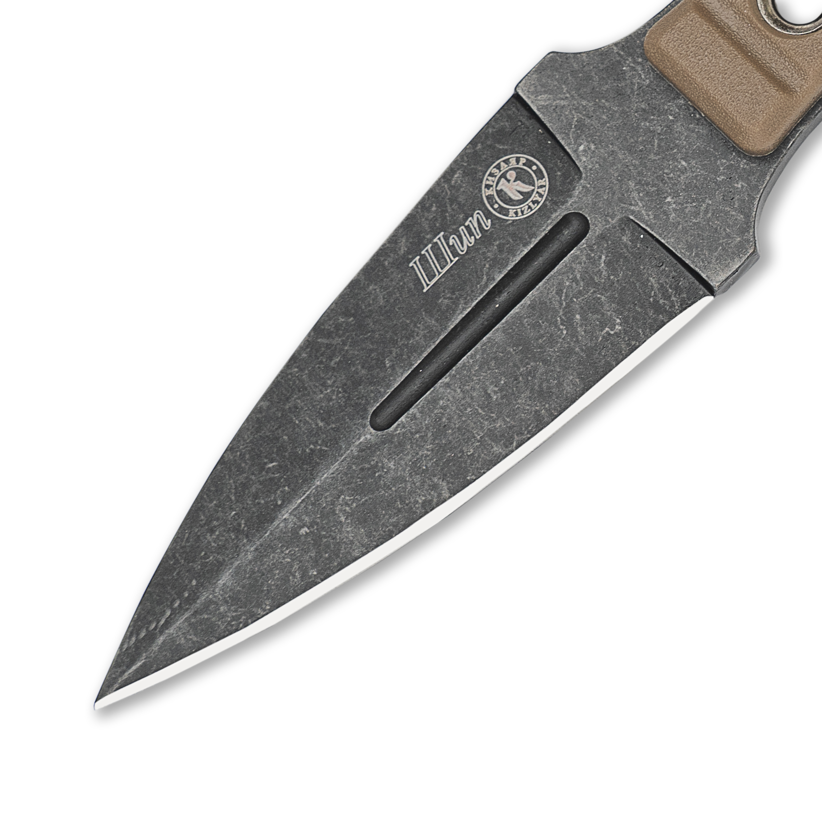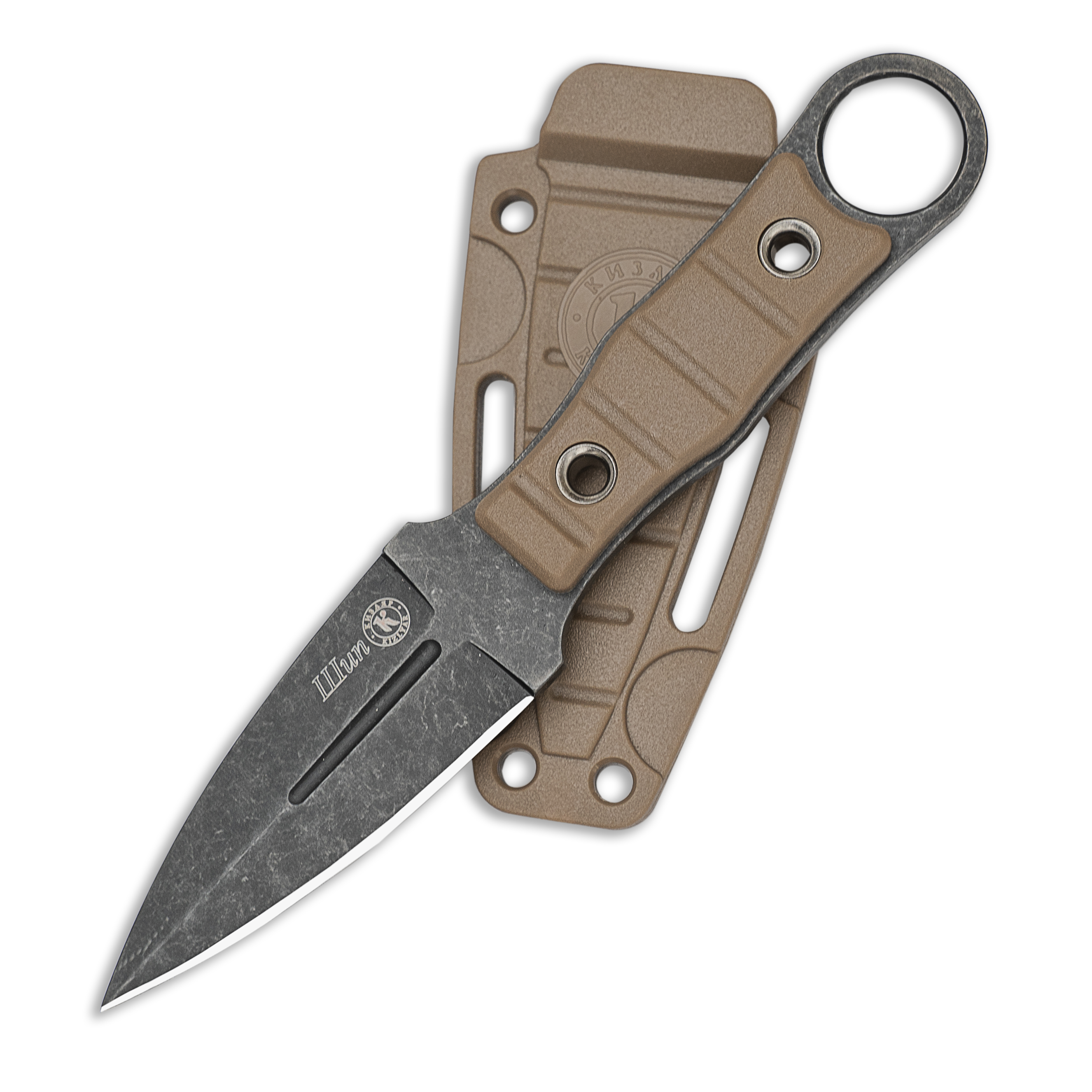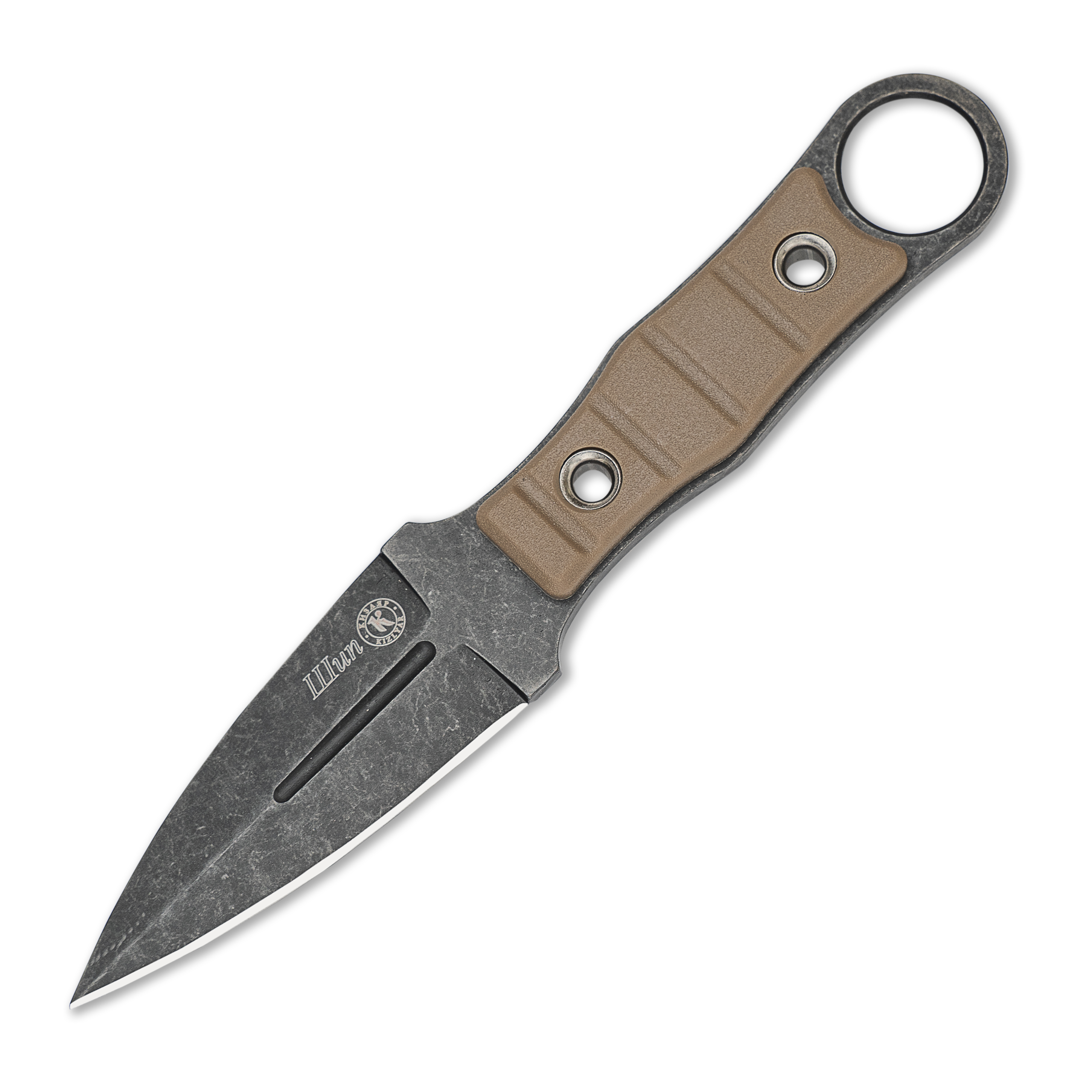 Чёрно-песочный Шип сочетает песочную рукоять и ножны с покрытием Black Stonewash на клинке и металле рукояти. Получается практичный набор: светлые элементы легко найти, а сталь выглядит аккуратно даже при активном использовании.