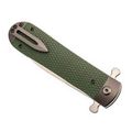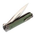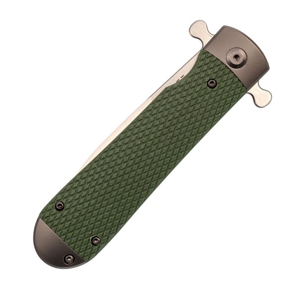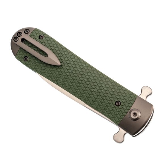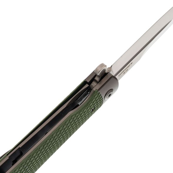 Рукоять состоит из стальных лайнеров, претин, обеспечивающих прочную основу, а также накладок из стеклотекстолита G10 с цепкой текстурой, напоминающей резьбу. Такой дизайн предоставляет уверенный и комфортный хват, даже во влажных или скользких условиях.