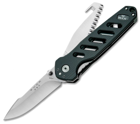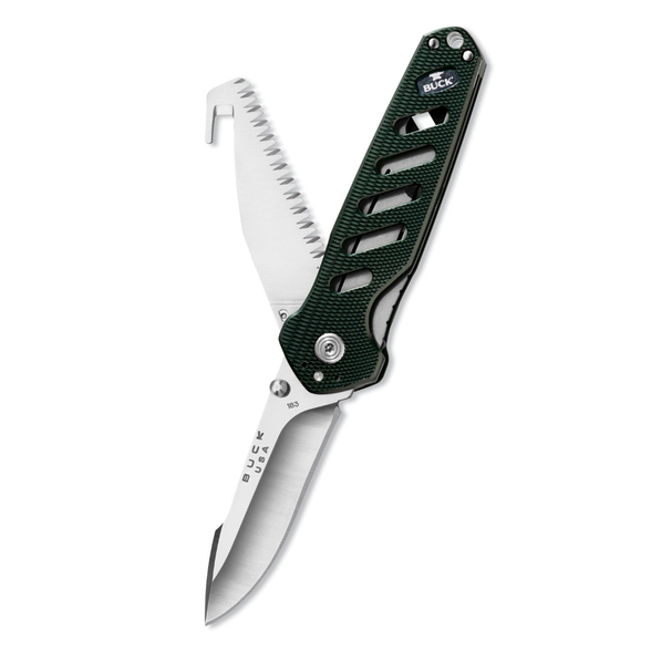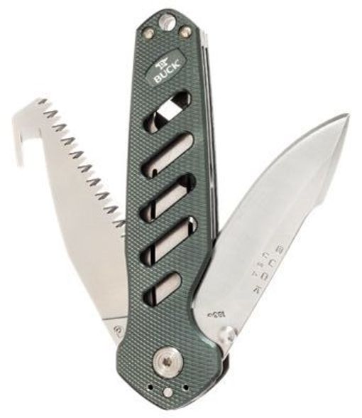 Нож складной 183 Alpha Crosslock BUCK 0183GRS - это многоцелевой инструмент, главное преимущество которого в наличии двух лезвий. Помимо основного клинка, в нем имеется дополнительное пилообразное лезвие с крюком, которое пригодится для разрезания брюшной полости, удаления ненужных сучков с веток или резе плотных тканей и ремней. Лезвия выполнены из высокоуглеродистой стали 420НС и обработаны методом сатинирования. Рукоять сделана из анодированного алюминия и имеет отверстие для клипсы. В комплект также входит нейлоновый чехол на кнопке.