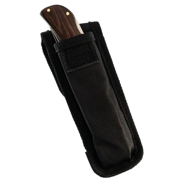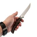 Рукоять ножа выполнена из натурального дерева, что обеспечивает комфортный хват и приятный внешний вид. Такой материал отличается долговечностью и эстетической привлекательностью. Конструкция ножа делает его спутником для активного отдыха, выживания или повседневного использования.
