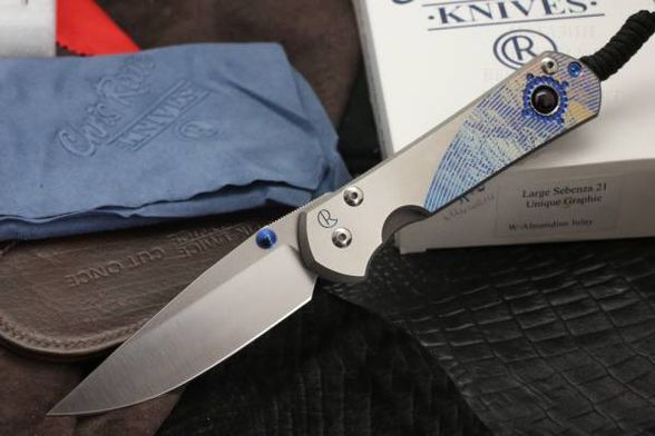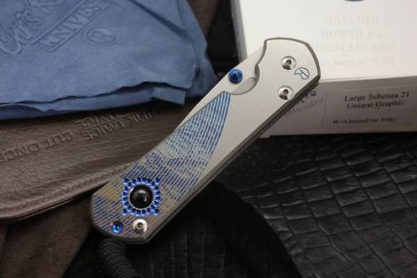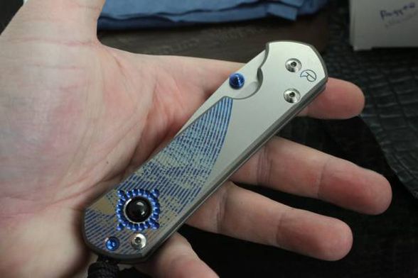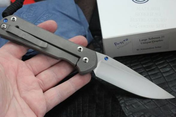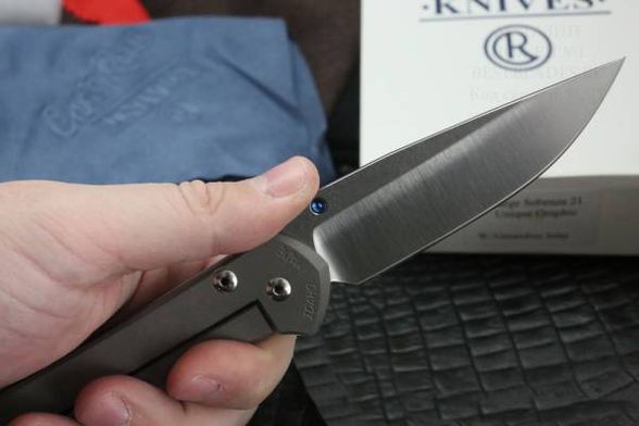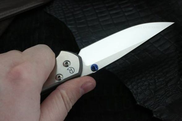 Рукоять ножа инкрустирована амльмандином (ювелирный гранат), обработанным методом кабошон
