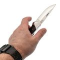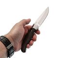 Рукоять состоит из стальных больстеров и накладок из дерева черного цвета. Они хорошо заполняют руку, что позволяет долго работать без дискомфорта. Подпальцевые выемки обеспечат надёжное и безопасное удержание. В наличии также есть клинки с рукоятками из G10.