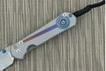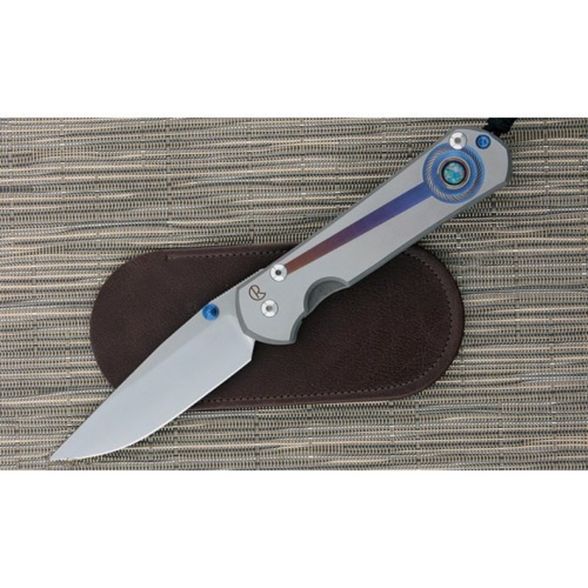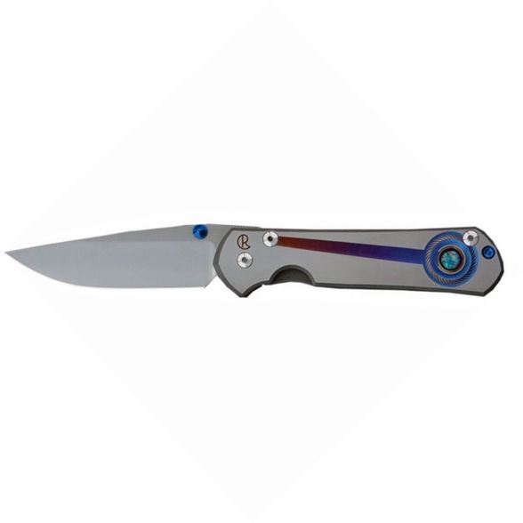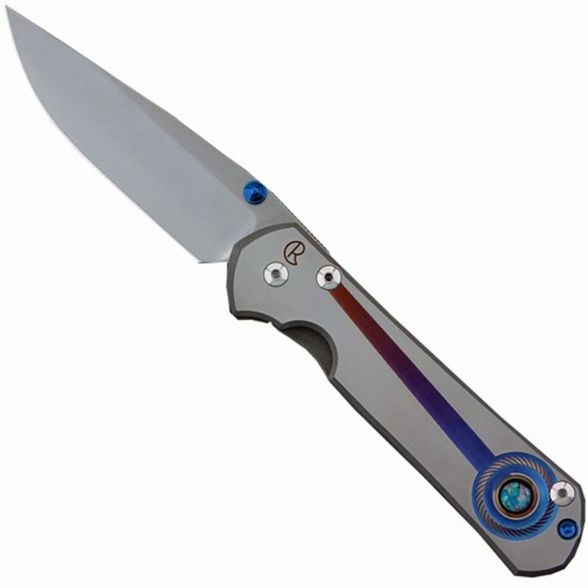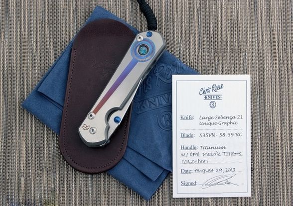 Рукоять ножа инкрустирована трёхцветной мозаикой из опала, обработанной методом кабошон