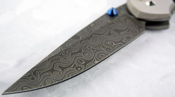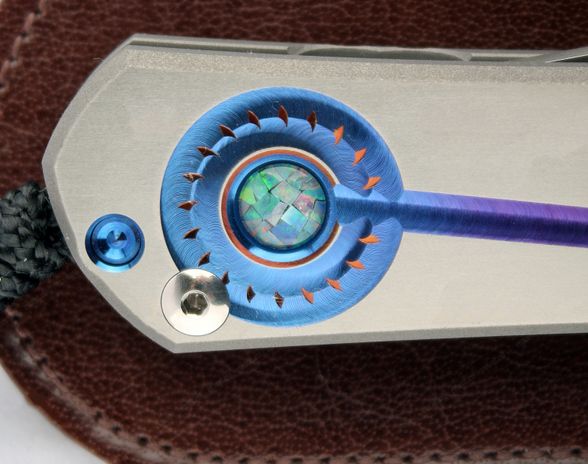 Рукоять ножа инкрустирована трёхцветной мозаикой из опала, обработанной методом кабошон