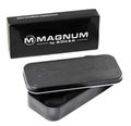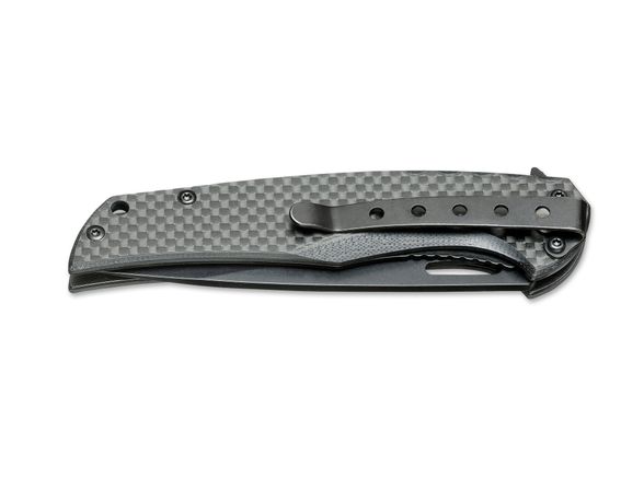 Рукоять ножа Boker Magnum Black Carbon не отягощает его общего веса, так как изготовлена из прочных металлических лайнеров, с подогнанными на них фигурными обкладами из очень красиво выделанного углеродного волокна переливчастой фактуры. На ее брюшке предусмотрены технологические изгибы под расположение пальцев, а стальной плавник, продолжающий обух, в открытом положении служит некой защитой ладони и местом ее упора. Надежным запирающим механизмом является замок Лайнер лок, с мелкой насечкой на открывающей пластине, что позволяет быстрее складывать нож, с наименьшим усилием. Карманная клипса имеет длинный, узкий перфорированный профиль, и позволяет одевать нож в положении острием вниз. Сквозное отверстие под темляк расширяет возможности безопасного использования инструмента. Нож Boker Magnum Black Carbon поставляется в красивом подарочном боксе из тонкого металла.