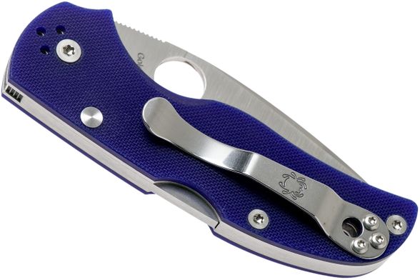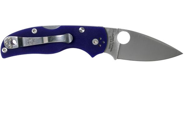 Рукоять ножа Spyderco C41PDBL5 изготовлена из практичного и красивого материала FRN глубокого темно синего цвета с очень цепким разнонаправленным рисунком Bi-Directional Texturing. Нейлоновые плашки плотно прикручены болтами на стальные лайнеры, имеющие скелетонированный дизайн. За счет такой конструкции и легковесных материалов, данный складной нож, остается очень прочным и надежным инструментом при своем незначительном весе. Фиксация клинка производится механизмом замка Back Lock. На рукояти имеется переставляемая 4-х сторонняя клипса из светлого полированного металла, а также отверстие для темляка.