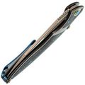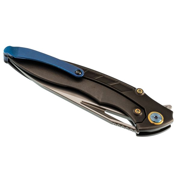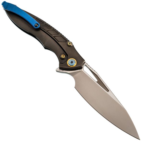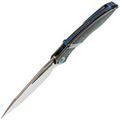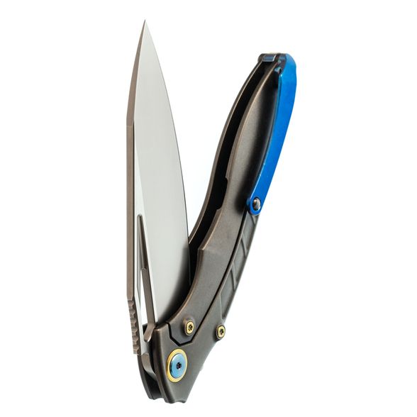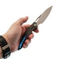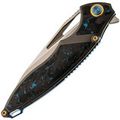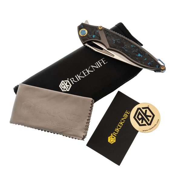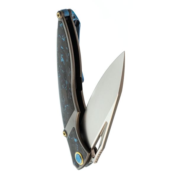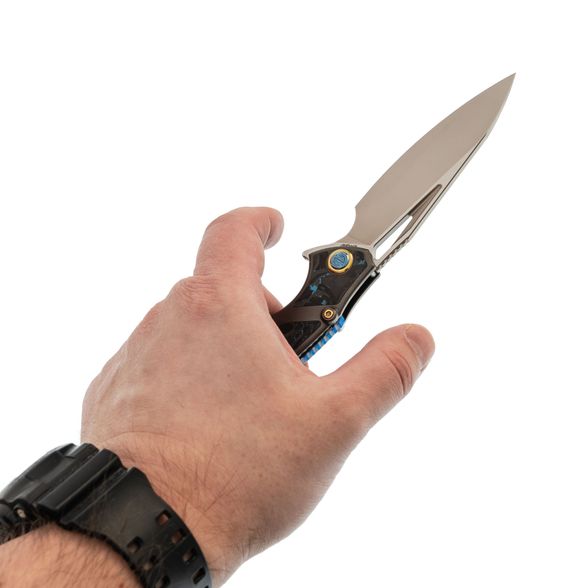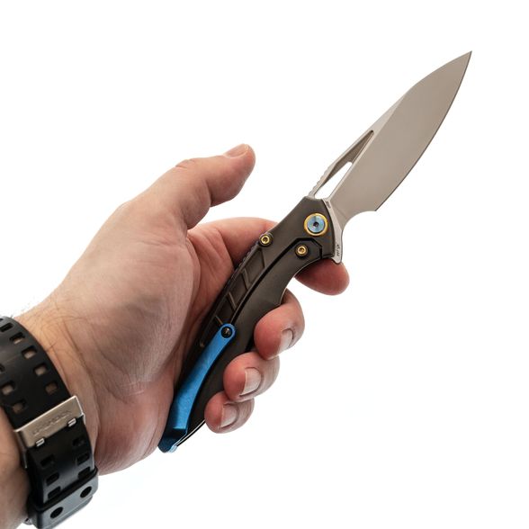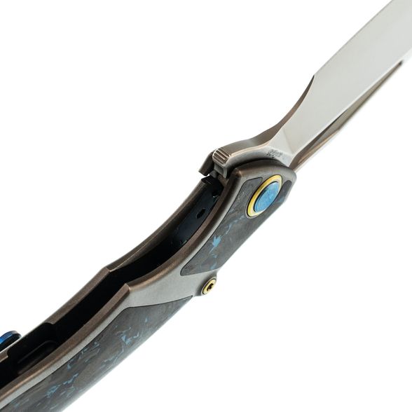 Ручка ножа представляет собой искусное сочетание титана с вставками из Carbon Fiber — материала, который славится своей прочностью, лёгкостью и элегантным внешним видом. Красивые синие прожилки на вставках добавляют акцент и уникальность каждому ножу. Замок Frame-Lock с сухарём гарантирует надёжную фиксацию во время работы, обеспечивая безопасность использования.