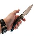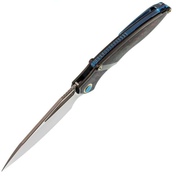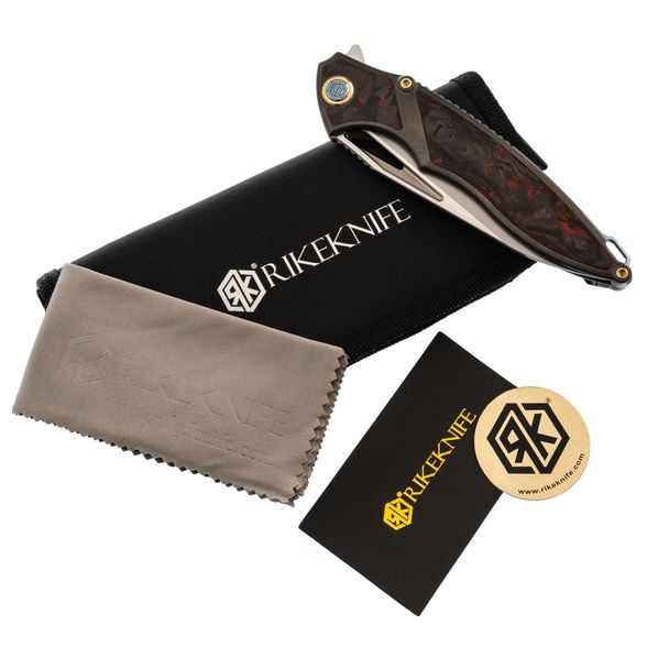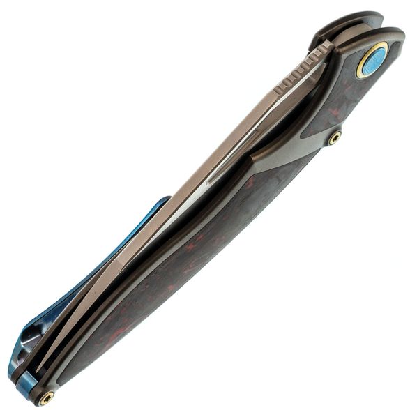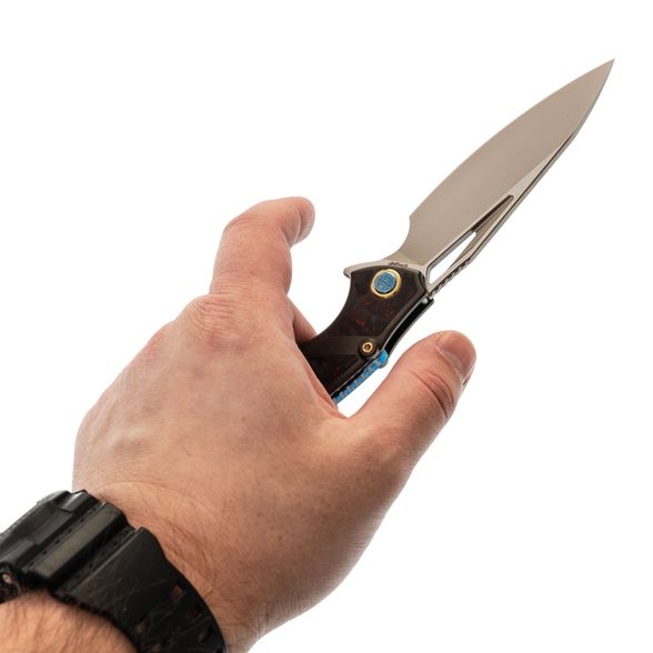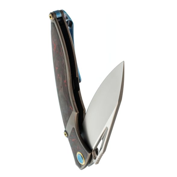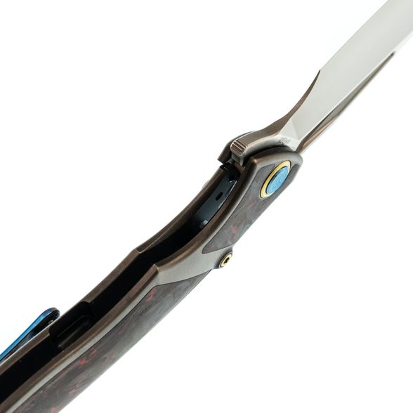Ручка ножа представляет собой искусное сочетание титана с вставками из Carbon Fiber — материала, который славится своей прочностью, лёгкостью и элегантным внешним видом. Красные прожилки на вставках добавляют некоторую агрессивную утонченность ножу. Замок Frame-Lock с сухарём гарантирует надёжную фиксацию во время работы, обеспечивая безопасность использования.