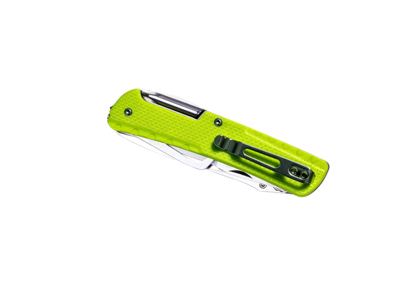 Многофункциональный раскладной нож включает в себя стеклобой, открывалки, пилу, карабин, прямую и крестообразную отвертки. Механизм фиксации клинка обеспечивает абсолютную неподвижность в открытом виде благодаря пластине-лайнеру.