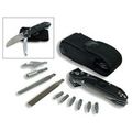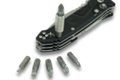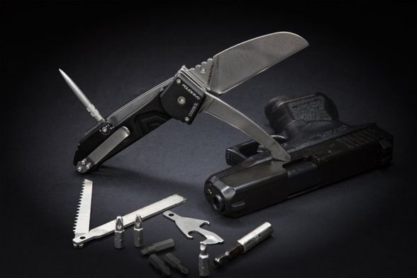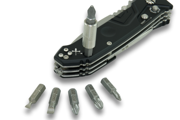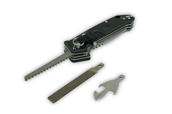 Автоматический выкидной стропорез с замком Button-Lock (открывается нажатием кнопки) и дополнительной блокировкой, Намагниченная отвёртка со сменными битами, Напильник, стеклобой, свайка (Marlin Spike), Пила для работы с различного рода материалами (дерево, пластик и лёгкие металлы)