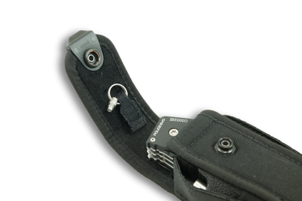 Нож складной с выкидным стропорезом Police EVO, сталь 690, пила, напильник, отвертки, открывалка, классический сатиновый + стропорез автоматический, рукоять черная алюминевая, чехол черный нейлон.