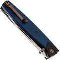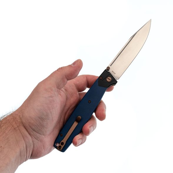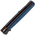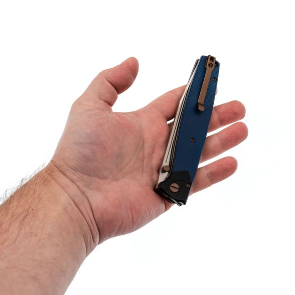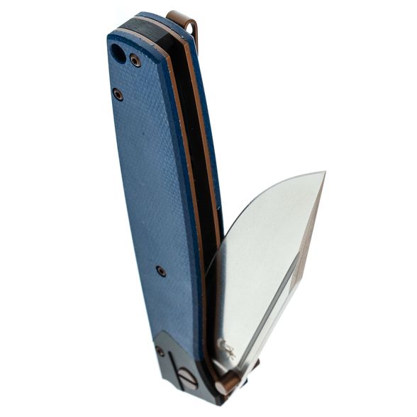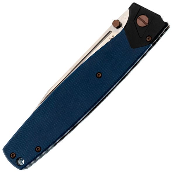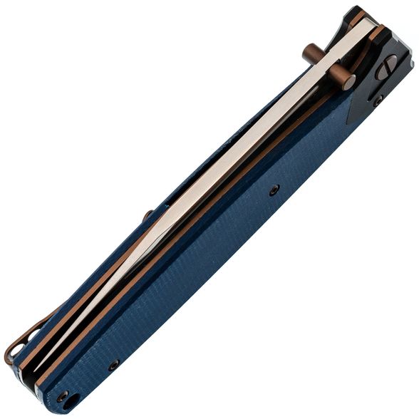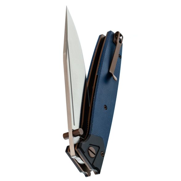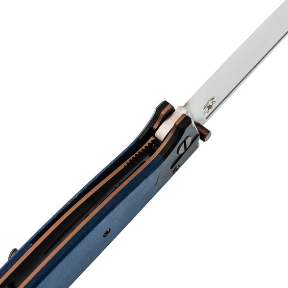Рукоять выполнена из синего стеклотекстолита G10, который сочетается с бронзовой фурнитурой и стальными лайнерами, а также черным спейсером и больстером. Такое сочетание материалов придает ножу элегантный и благородный внешний вид. G10 и сталь - это прочные и надежные материалы, устойчивые к воздействию окружающей среды. Замок Liner-Lock обеспечивает надежную фиксацию клинка в рабочем положении и простоту в использовании. Рукоять также оснащена темлячным отверстием для дополнительной персонализации и удобства ношения.