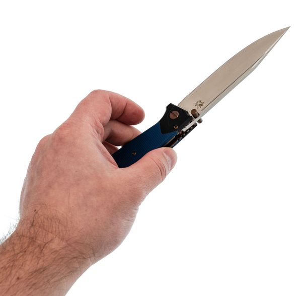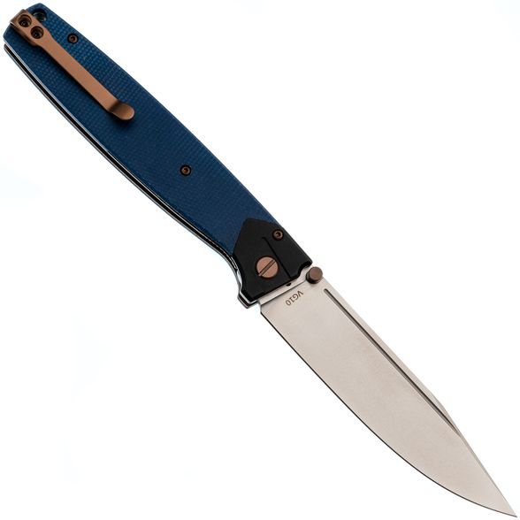 Клинок изготовлен из японской нержавеющей стали VG-10, которая обеспечивает отличную остроту и длительное удержание режущих свойств, а также хорошее сопротивление коррозии. Форма клинка - это смелый и узнаваемый профиль Clip-Point с высокими прямыми спусками, что позволяет эффективно выполнять рез по различным материалам. Нож открывается с помощью двух шпеньков, а подшипники в осевом узле обеспечивают плавное и быстрое открытие.