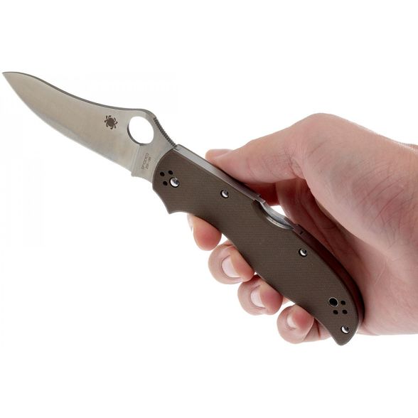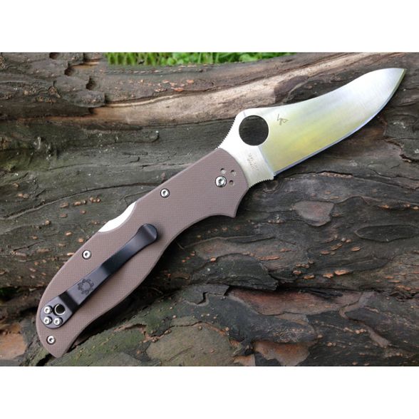 Даная модель Spyderco Stretch 2 C90GBNPE2 отчается коричневой рукоятью из премиум материала G-10 со стальными лайнерами внутри, и клинком из порошковой инструментальной стали, с повышенным содержанием хрома и сверхвысоким содержанием углерода ZDP-189, производства Японии.