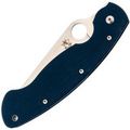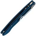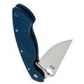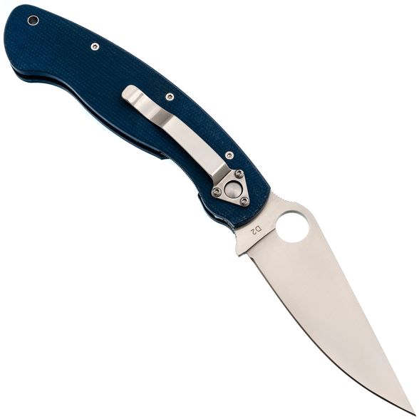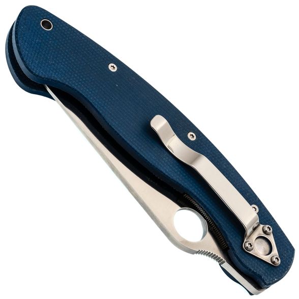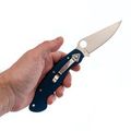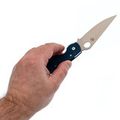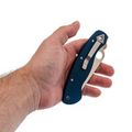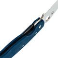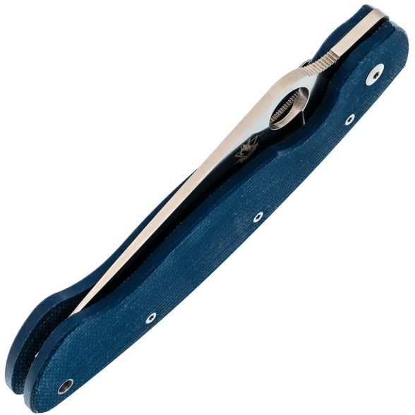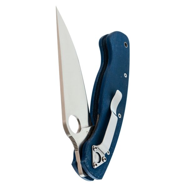 Рукоять изготовлена из микарты, что обеспечивает идеальное сочетание прочности, легкости и приятной на ощупь текстуры. Со временем накладки из микарты приобретают уникальный винтажный вид. Синий цвет рукояти делает нож заметным на фоне окружающей природы. Форма рукояти тщательно продумана для максимального комфорта и удобства, подойдет большинству пользователей. Нож оснащен темлячным отверстием, а замок Liner-Lock обеспечивает надежную фиксацию клинка даже при грубых работах.